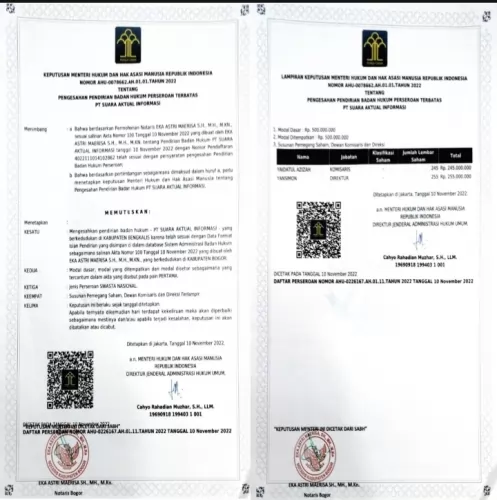 Dikelola PT. Suara Aktual Informasi Pertama kali online pada 2022 AKTA NOTARIS EKA ASRI SH Mkn"PT. Suara Aktual Informasi" Berdasarkan Undang Undang Nomor 40 Tahun 1999 tentang Pers.