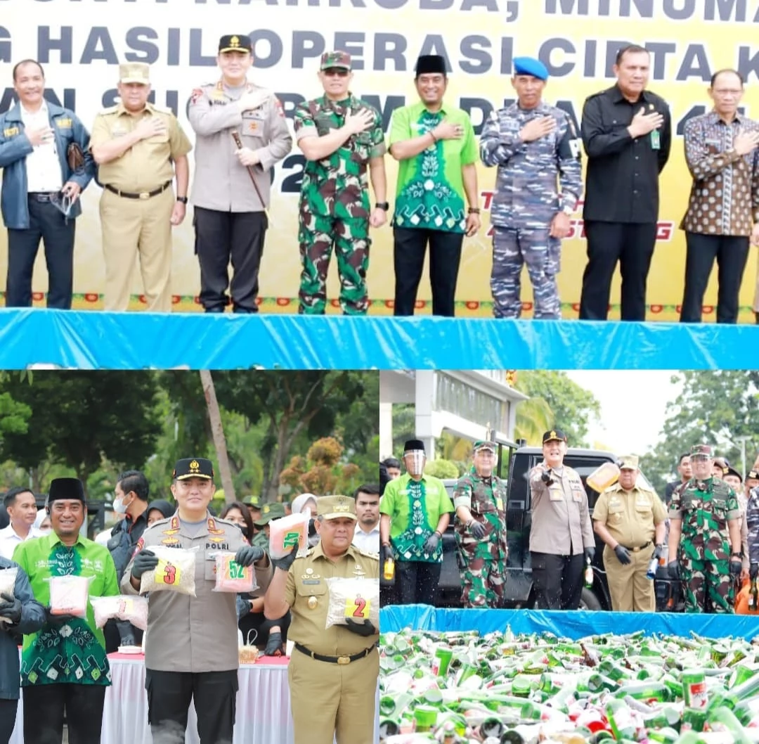 PEKANBARU - Jajaran Kepolisian Daerah (Polda) Riau, lakukan kegiatan pemusnahan puluhan kilogram barang bukti narkoba, belasan ribu minuman keras hingga ribuan botol minuman menyambut Bulan Suci Ramadan, Selasa (21/3/2023).