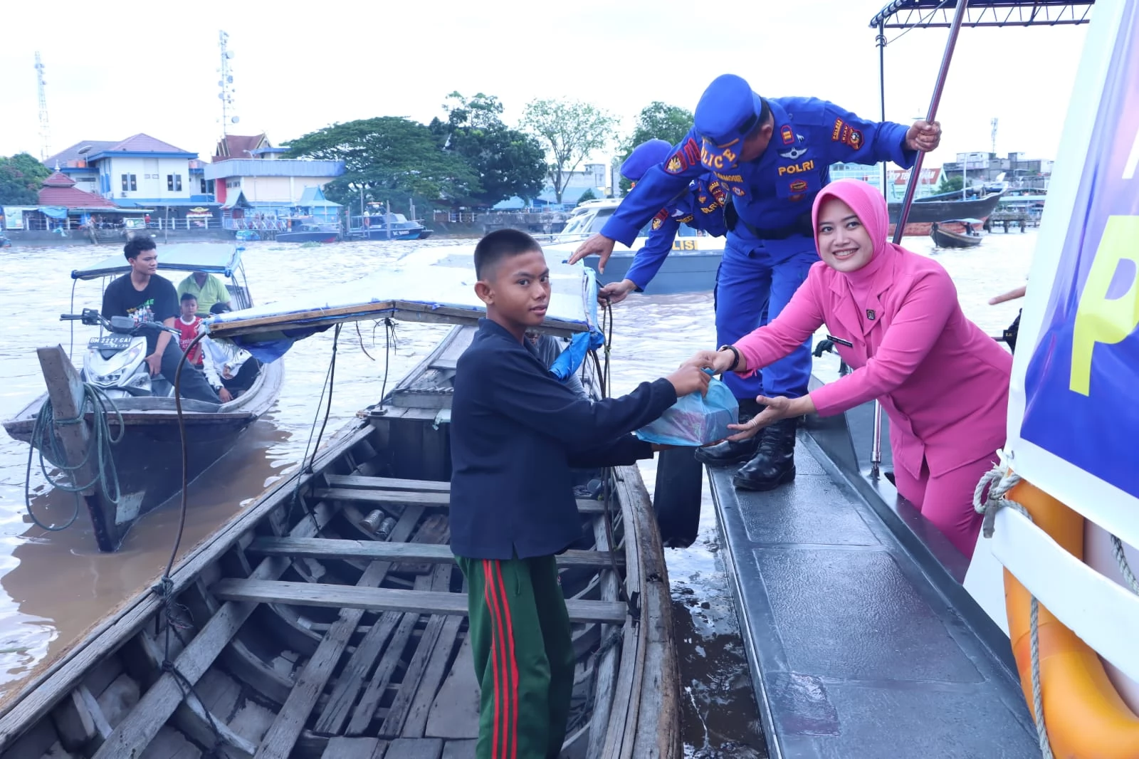 Dari pantauan team dilapangan, terlihat para pengemudi kapal motor dan penumpang menerima bantuan sosial tersebut sambil senyum sumringah.