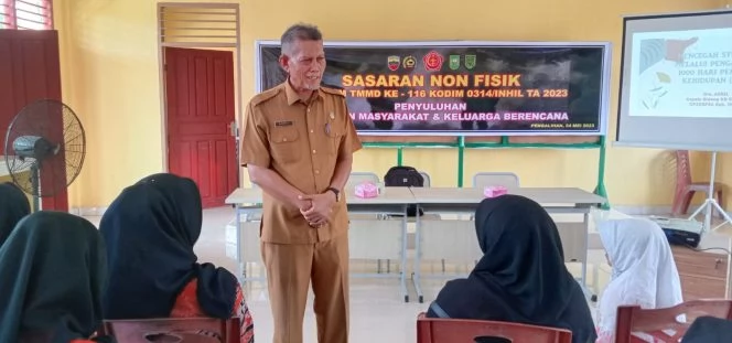 Kegiatan penyuluhan kesehatan masyarakat KB, dilaksanakan Satgas TMMD dengan menggandeng Dinas DP2KBP3A kab.Inhil, Drs. Asril yang menjabat sebagai kepala bidang KB dan K3 kabupaten Indragiri Hilir.