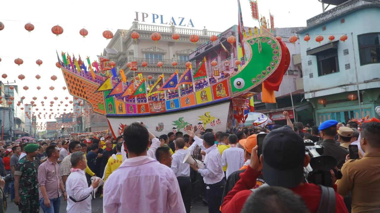 ROHIL Lintasliputan.com – Dibawah cuaca berawan, ribuan mata memandangi puncak ritual Bakar Tongkang di di kelenteng Ing Hok King, Bagansiapiapi Kabupaten Rokan Hilir, Riau, Selasa (4/7) sore. Arak-arakan lautan manusia membawa dupa mengikuti replika kapal tongkang disepanjang jalan Kelenteng menuju tempat pembakaran.