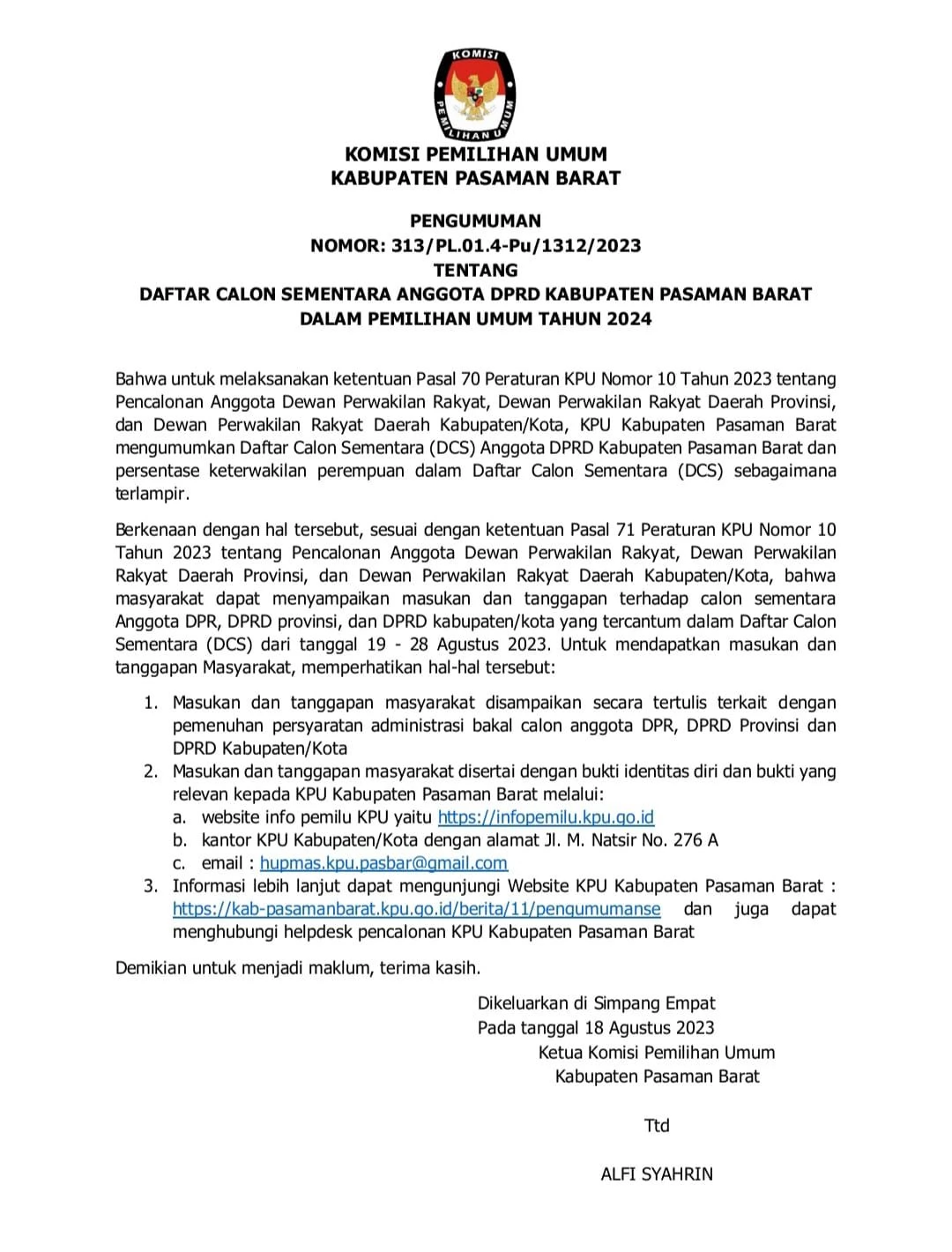 bahwa masyarakat dapat menyampaikan masukan dan tanggapan terhadap Calon Sementara Anggota DPR DPRD Provinsi, dan DPRD Kabupaten /Kota yang tercantum dalam Daftar Calon Sementara (DCS),dari tanggal 19-28 Agustus 2023, untuk mendapatkan masukan dan tanggapan masyarakat,(Dedinofrizal)