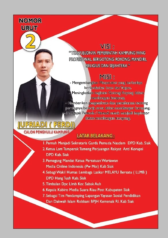 LINTAS LIPUTAN. COM, - Jufriadi calon Penghulu Kampung no urut 2 siap membangun dan memajukan Kampung Selat Guntung Kecamatan Sabak Auh, Kabupaten Siak.