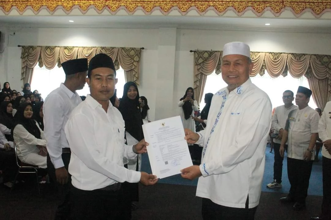 Pasbar(Lintasliputan.com) - Bupati Kabupaten Pasaman Barat (Pasbar) Hamsuardi didampingi Wakil Bupati Risnawanto, Sekretaris Daerah (Sekda) Hendra Putra, Plt Kepala BKPSDM Adrianto dan stakeholder terkait, kembali menyerahkan Surat Keputusan (SK) Pengangkatan 413 Pegawai Pemerintah dengan Perjanjian Kerja (PPPK) Guru, formasi tahun 2022, Jumat (13/10) di Aula Kantor Bupati setempat.