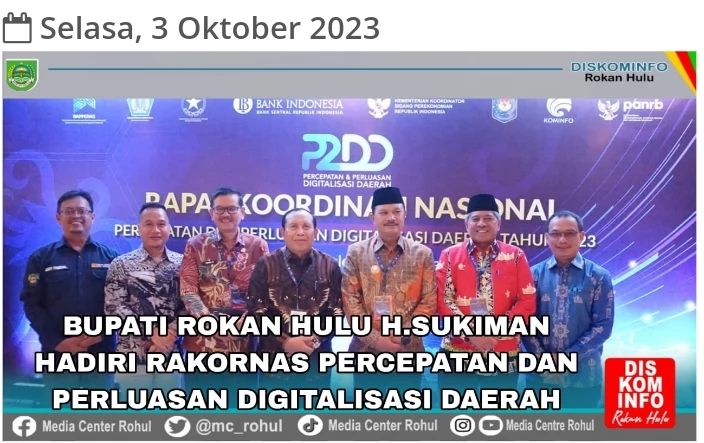 “Rakornas ini adalah forum koordinasi percepatan dan perluasan digitalisasi daerah, dan Pemkab Rokan Hulu akan segera menindak lanjuti dengan membentuk Tim Percepatan dan Perluasan Digitalisasi Daerah (TP2DD) Kabupaten Rokan hulu yang akan ditetapkan dalam keputusan Bupati Rokan Hulu dan Sekretaris Daerah Kab. Rokan Hulu nantinya yang akan berperan sebagai Ketua Harian,”ujar H. Sukiman.