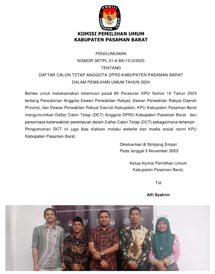 Pasbar,(Lintasliputan.com) _ Komisi Pemilihan Umum (KPU) Pasbar tetapkan Daftar Calon Tetap (DCT) peserta Calon Legislatif Pasaman Barat (DPRD PASBAR) sebanyak 498 orangcalon pada hari Jum'at 03/11/23 di KPU Pasaman Barat setelah menempuh waktu yang cukup lama sejak Daftar Calaon Sementara (DCS) hingga sekarang dan dengan perlengkapan syarat dari seluruh calon dinyatakan telah lengkap.