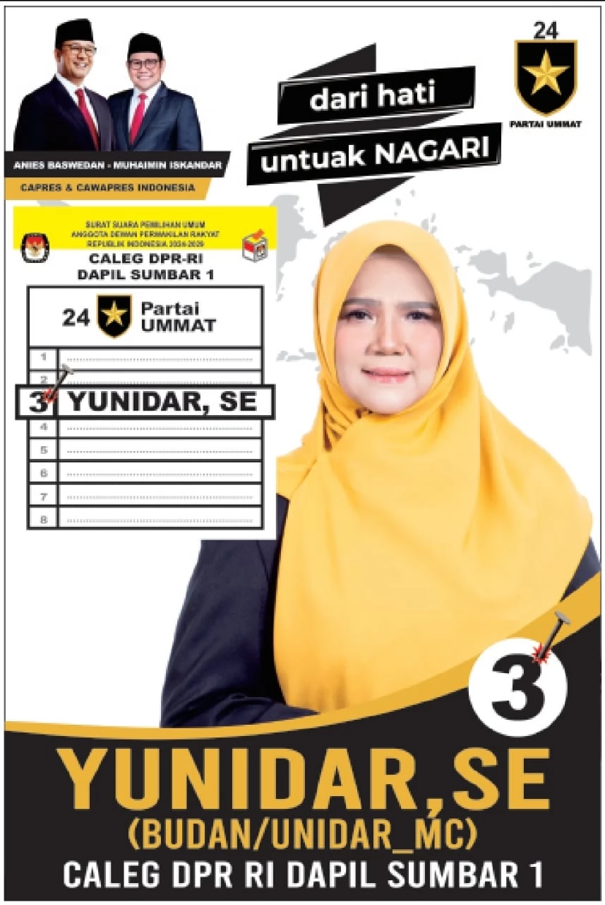 Daerah Pemilihan Yunidar.SE Senagai Caleg DPR RI , Dari Partai Ummat Dapil 1 Sumatera Barat Nomor Urut 3. Yaitu Darmas Raya , Kabupaten Sawah Lunto Sijunjuang , Kabupaten Tanah Datar, Kota Padamg Panjang , Solok Selatam , Kabupaten Solok , Kota Solok , Kabupaten Pesisir Selatan, Kota Padang Dan Kepulauan Memtawai.