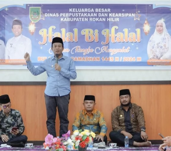 Wakil Bupati Rohil H. Sulaiman, SS., MH, saat memberikan sambutan pada acara halal bihalal di Dinas Perpustakaan dan Kearsipan Kabupaten Rokan Hilir, Kamis (7 maret 2024). Dalam sambutannya beliau menyampaikan Mudah-mudahan Allah mengampuni semua kesalahan kita karena sesuai janji-Nya, Allah akan mengampuni semua hamba yang memohon ampun kepada-Nya.