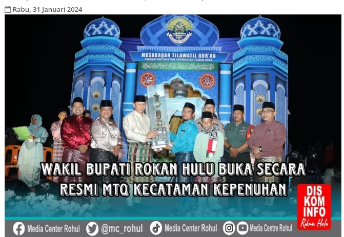 Rokan Hulu—Pembukaan Helatan Musabaqoh Tilawatil Quran (MTQ) Tingkat Kecamatan Kepenuhan Kabupaten Rokan Hulu tahun 2024 dengan Dihadiri Wakil Bupati Rokan Hulu H.Indra Gunawan didampingi Ketua GOW Rokan Hulu Ny.Sri Yulita Indra Gunawan berlangsung dengan meriah.
