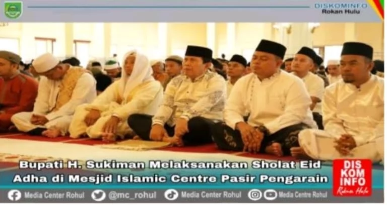 Rokan Hulu–Bupati Rokan Hulu (Rohul) H.Sukiman didampingi Ketua TP PKK Hj. Peni Herawati Sukiman melaksanakan Shalat Idul Adha 1445 H /2024 M bersama Ribuan Umat Muslim lainnya di Islamic Center Rokan Hulu, Senin (17/06/2024).