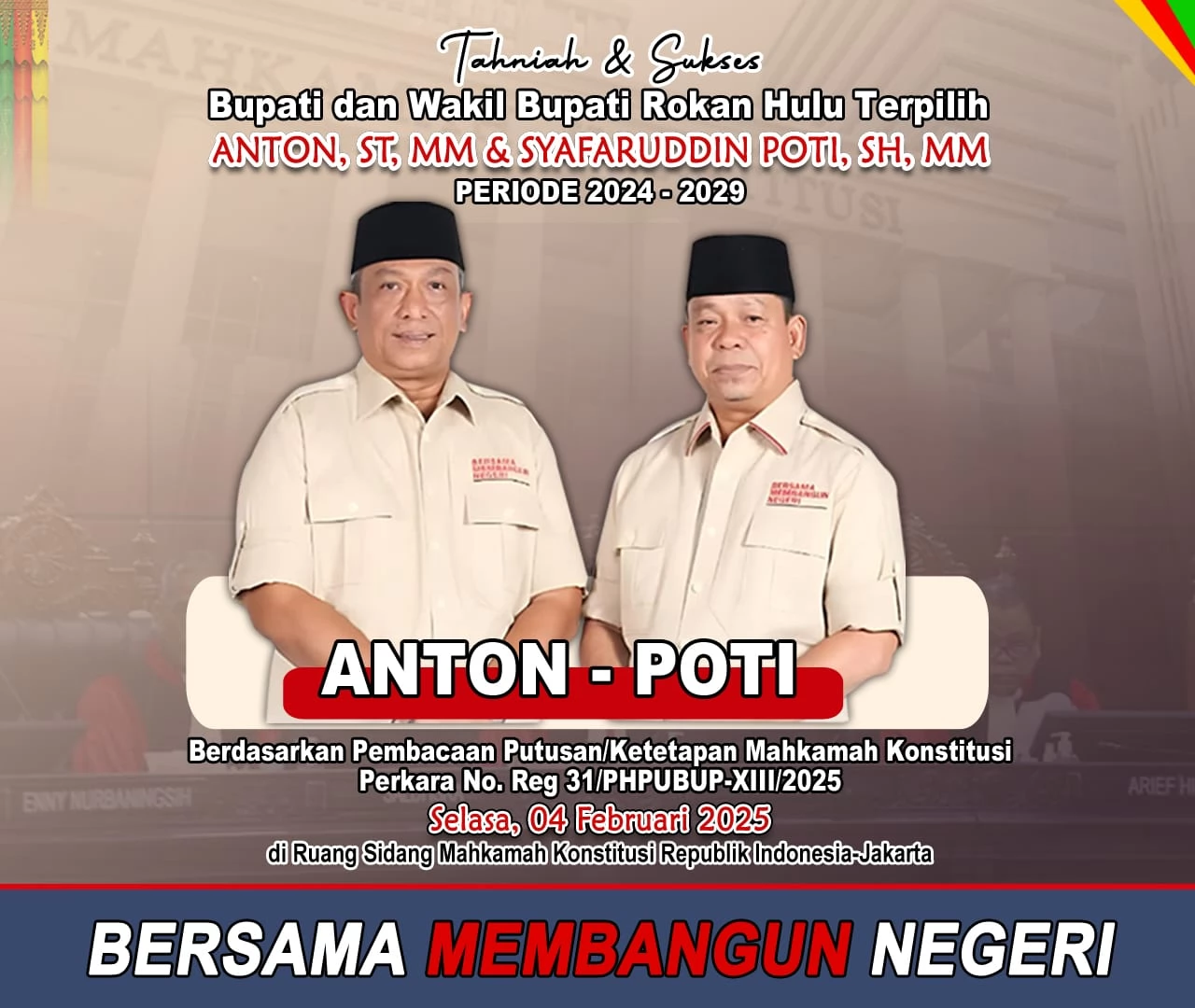 Berdasarkan putusan tersebut maka sudah dipastikan pasangan Bupati dan Wakil Bupati terpilih no urut 3 pasangan Anton - Poti akan turut dilantik pada pelantikan serentak yang akan berlangsung pada 18 februari 2025 di Jakarta.