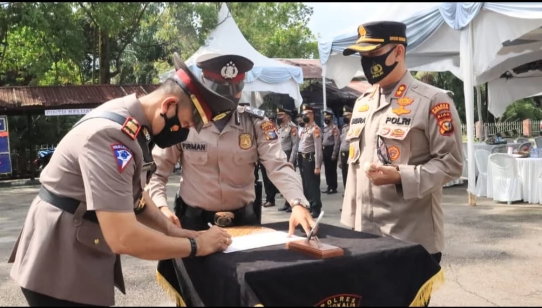 DURI,lintasliputan.com - Kapolres Bengkalis, AKBP Indra Wijatmiko langsung memimpin Sertijab pergantian Kasat Lantas lama, AKP Hairul Hidayat SIK MM ke Kasat yang baru, AKP Kaliman Siregar SH. Acara Sertijab berlangsung di depan halaman Polsek Mandau, Selasa (29/3).