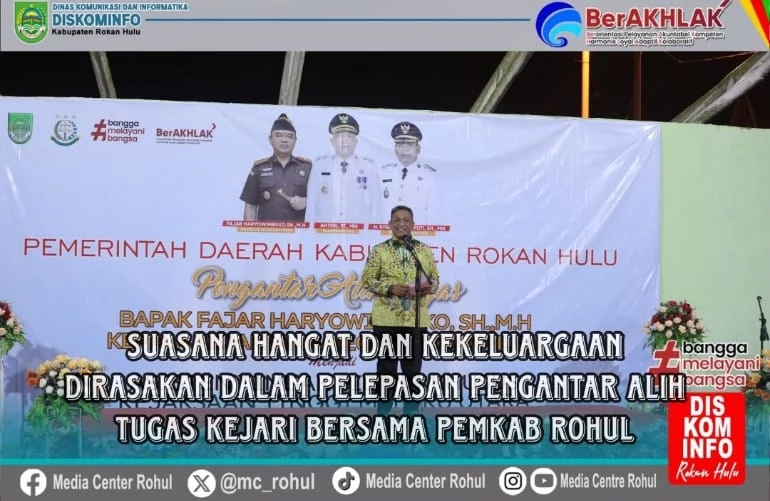 Rokan Hulu—Pemerintah Kabupaten (Pemkab) Rokan Hulu (Rohul) gelar acara pengantar alih tugas Kepala Kejaksaan Negeri (Kajari) Rohul Fajar Haryowimboko, S.H., M.H., yang kini mendapatkan promosi dan mutasi jabatan sebagai Asisten Tindak Pidana Khusus pada Kejaksaan Tinggi Maluku Utara. Acara yang penuh kehangatan dan kekeluargaan ini dilaksanakan pada Selasa, (22/07/2025) bertempat di Lapangan Tenis Rumah Dinas Bupati Rohul.