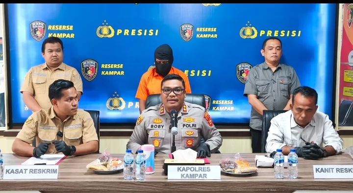 BANGKINANG - Polres Kampar berhasil mengungkap kasus dugaan pembunuhan berencana atau kelalaian yang mengakibatkan korban meninggal dunia di Desa Kualu, Kecamatan Tambang, Kabupaten Kampar, dalam waktu kurang dari 24 jam. Konferensi pers terkait kasus ini dipimpin langsung oleh Kapolres Kampar AKBP Boby Putra Ramadhan S, didampingi Kasat Reskrim Polres Kampar AKP Gian Wiatma Jonimandala dan Kanit Reskrim IPTU Syahrial, Minggu (31/8/2025).