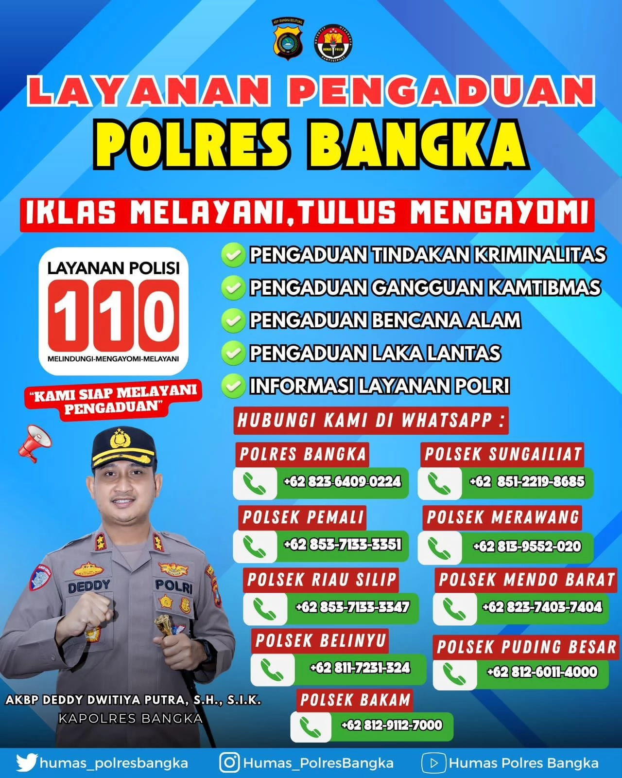 Selain melalui layanan darurat Polri di nomor 110, masyarakat juga dapat menyampaikan pengaduan melalui layanan WhatsApp yang telah disediakan oleh Polres Bangka maupun jajaran Polsek di wilayah hukum Polres Bangka.