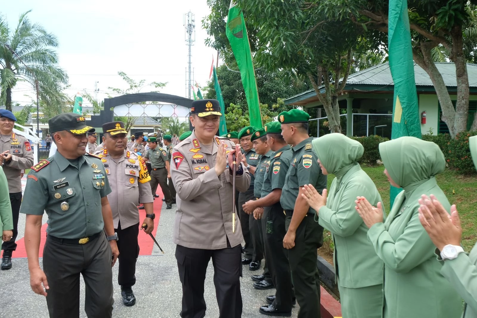 Mulai dari gerbang masuk, Irjen Iqbal sudah ditunggu oleh personel Kodim 0313/KPR yang berjejer rapi. Selain mendapat sambutan penghormatan, kedatangan Irjen Iqbal juga diiringi nyanyian yel-yel selamat datang dan tepuk tangan, yang membuat suasana terasa gegap gempita.