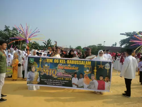 Duri - Pada hari Minggu tanggal 3/7/22 . tempat di jln Cendana RW 4 lapangan kuning Nusantara satu pawai ta'ruf musabaqah Tilawatil Qur'an (MTQ) KE III ,RW 6 meramaikan pawai dengan menjadi perserta Pawai MTQ Ke-III Tingkat Kelurahan babussalam kecamatan Mandau Kabupaten Bengkalis Provinsi Riau dimulai dengan Pawai Ta'ruf yang diikuti oleh seluruh kafilah dan masyarakat Kelurahan babussalam kecamatan Mandau dengan garis start dari jln Cendana RW 4 lapangan kuning Nusantara satu dan Finish di Mesjid As-salam Hangtuah, Minggu (3/07/22).
