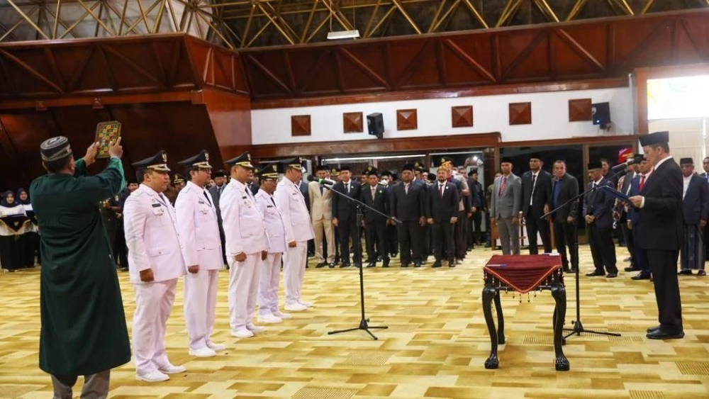 Banda Aceh - Pj Gubernur Aceh Achmad Marzuki mewakili Presiden Republik Indonesia mengambil sumpah dan melantik Pj Bupati Bener Meriah Haili Yoga bersama 3 Pj bupati dan 1 Pj Walikota lainnya di Anjong Mon Mata Banda Aceh, Kamis (14/7/2022) sore.