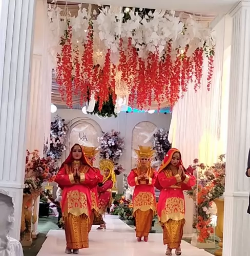 Setelah masuk Tenda Area Pesta, Pengantin Disambut lagi dengan Tari Persembahan Minangkabau oleh para penari Panglimo Campo. Satu persatu tarian dan atraksi disuguhkan oleh Panglimo Campo, mulai dari arak iring pengantin hingga tari persembahan.