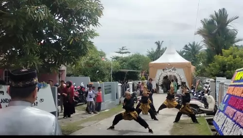 Rombongan konvoi mobil Hard Top turun dari mobil memasuki lokasi pesta diiringi irama tambua Panglimo Campo, meskipun sudah berkeliling, namun para pemain tambua masih semangat mengarak Rombongan Pengantin. Sebelum memasuki lokasi pesta, sepasang pengantin berserta rombongan di sambut dengan Silat Gelombang ciri Khas Minangkabau Provinsi Sumatera Barat yang di mainkan oleh Group Tambua Dan Sanggar Tari Panglimo Campo yang berdomisili di kota Duri kecamatan Mandau Kabupaten Bengkalis Provinsi Riau.