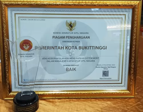 Ketua KASN, Prof.DR.Agus Pramusinto.M.D.A, menyampaikan apresiasi dan terima kasih atas komitmen dan dukungan dalam optimalisasi dan akselerasi penerapan Sistem Merit dalam Kebijakan dan Manajemen ASN di lingkungan Instansi Pemerintah. Sesuai dengan Peraturan Presiden Nomor 18 Tahun 2020 tentang Rencana Pembangunan Jangka Menengah Nasional (RPJMN) Tahun 2020-2024, yang telah menetapkan sasaran reformasi birokrasi dan tata kelola pemerintah sebagai sebuah arah kebijakan dan strategi nasional. “Salah satu indikatornya adalah persentase instansi pemerintah dengan Indeks Sistem Merit Kategori “Baik” dan “Sangat Baik”. Sehubungan dengan hal tersebut, pada tahun 2022 KASN telah melaksanakan serangkaian kegiatan pembinaan dan penilaian, serta menetapkan tingkat penerapan Sistem Merit dalam Manajemen ASN terhadap Instansi Pemerintah di Kementerian, Lembaga, dan Pemerintah Daerah dengan kategori “Sangat Baik” dan “Baik”,” jelasnya. Wali Kota Bukittinggi, Erman Safar, melalui Kepala BKPSDM Bukittinggi, Sustinna, menyampaikan rasa syukur atas anugerah meritokrasi yang diterima tiga kali berturut-turut ini. Dalam penerapan sistem merit, Pemerintah Kota Bukittinggi berkorelasi positif dengan penghargaan BKN Award, kategori perencanaan kebutuhan dan mutasi kepegawaian, serta spesial pilot project SIASN. "Alhamdulillah hari ini Kota Bukittinggi kembali menerima penghargaan dari KASN, meraih prestasi dalam penerapan sistem merit di Tingkat Nasional. Wali Kota Bukittinggi menjadi salah satu dari 161 Kepala Daerah Kabupaten/ Kota se Indonesia yang meraih anugerah ini dan di Sumbar hanya enam kota dan kabupaten yang mendapat penghargaan, salah satunya kita Bukittinggi. Untuk itu, Wako juga menyampaikan terima kasih kepada pimpinan SKPD yang sudah terlibat dalam proses sehingga masuk kategori daerah terbaik se-Indonesia," Penerapan sistem merit yang baik merupakan bukti nyata komitmen PPK dalam menginterpretasikan Undang-undang demi terwujudnya birokrasi yang bersih dan akuntabel, tidak sekedar menempatkan right man on the right place namun juga memandang pegawai sebagai asset berharga yang perlu dikembangkan dan dikelola. Tentunya diperlukan kerja keras dan komitmen bersama seluruh pemangku kepentingan untuk meningkatkan kualitas tata kelola manajemen ASN di Kota Bukittinggi.(lintas liputan/IKP/DISKOM/montes)