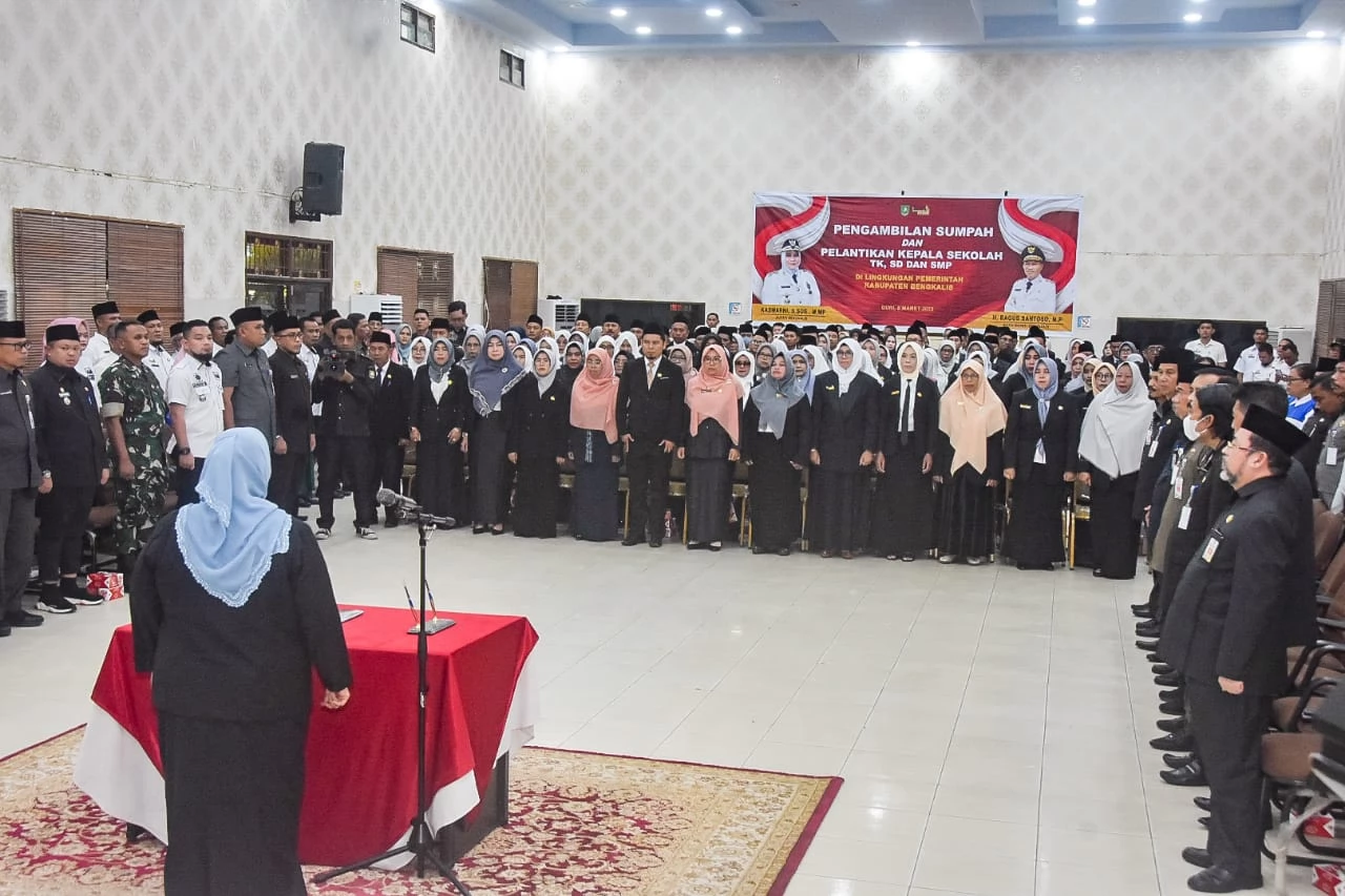 MANDAU - Lintas Liputan.com.Bupati Bengkalis Kasmarni mengambil sumpah dan melantik 163 Kepala Sekolah (Kepsek) TK, SD dan SMP se Kabupaten Bengkalis, di Gedung Bathin Betuah, Kantor Camat Mandau, Rabu, 8 Maret 2023.