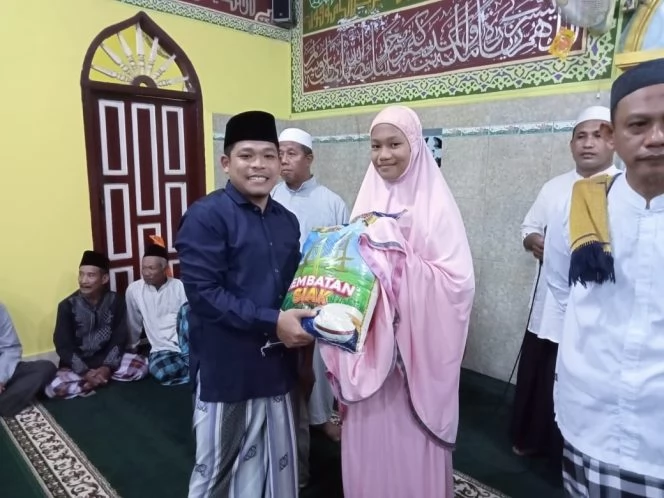 Kades Syaifullah menyerahkan bantuan sembako untuk anak yatim di wilayah masjid Alfalah Dusun Dua