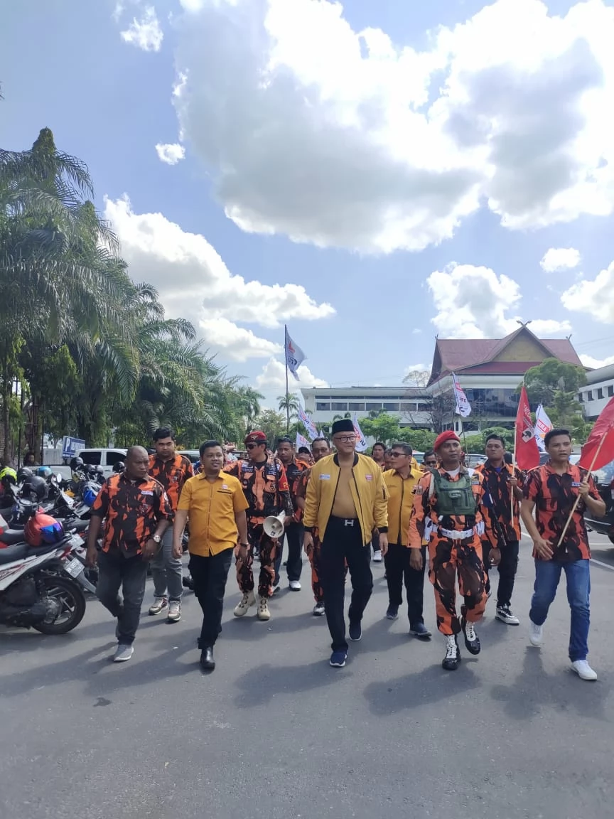 Pekanbaru, Ratusan anggota Pemuda Pancasila (PP) kota Pekanbaru memadati kantor Komisi Pemilihan Umum (KPU) Riau yang berada di jalan gajah Mada Minggu (14/5/2023). Kehadiran. Ratusan massa PP itu untuk mengantar tokoh muda Riau Suhermanto sebagai caleg DPRD Riau dari partai Hanura.