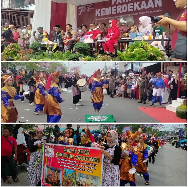 Duri, - Sanggar Tari Dan Group Tambua Panglimo Campo bermarkas di jln Nusantara satu Gg.Sriwijaya kelurahan Babussalam Kecamatan Mandau Kabupaten Bengkalis Riau, ikut berpartisipasi pada pawai sekaligus memeriahkan Hari Ulang Tahun (HUT) ke 78 Kemerdekaan Republik Indonesia tahun 2023 yang digelar Pemerintah Kecamatan (Pemcam) Mandau, pada Sabtu (19/8) pagi.