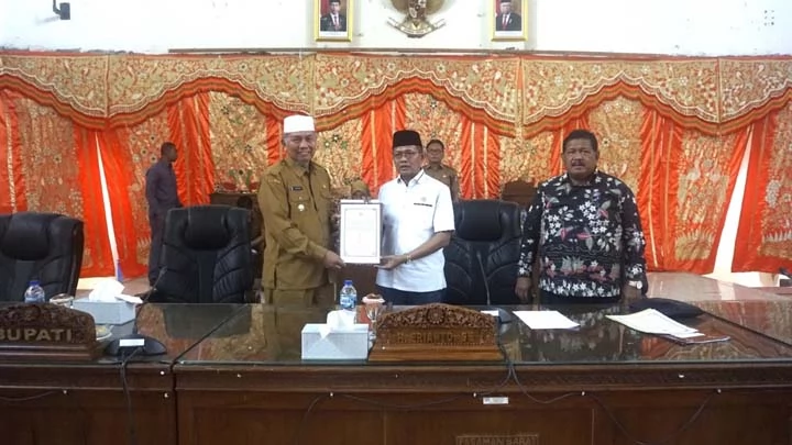 Pasaman Barat– Bupati Pasaman Barat (Pasbar) Hamsuardi didampingi stakeholder terkait menghadiri sekaligus menyampaikan jawaban atas laporan Pansus DPRD terhadap Ranperda tentang Pemberian Insentif dan pemberian kemudahan investasi di daerah serta Ranperda tentang Perubahan Atas Perda nomor 9 tahun 2016 tentang Perlindungan Lahan Pertanian Pangan Berkelanjutan, Senin (9/10) di Ruang Rapat DPRD setempat.