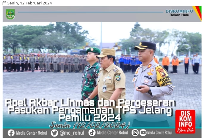 Rokan Hulu—Menghadapi pesta Demokrasi yang dilaksanakan pada 14 Januari 2024 mendatang,Pemerintahan Kabupaten(Pemkab)Rokan Hulu (Rohul) gelar Apel Akbar Linmas dan Pergeseran Pasukan serta Pengamanan TPS dalam rangka Hitung dan Pungut Suara Pemilu, yang dilaksanakan di Halaman Kantor Bupati Rohul (12/02/2024).