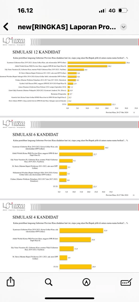 Terbaru, syamsuar Memimpin dalam simulasi Pemilihan Gubernur Riau 2024 . Hal ini diperoleh dari hasil survei terbaru dari Lembaga Survei Indonesia (LSI) yang dilakukan pada tanggal 20 hingga 27 Mei 2024 .