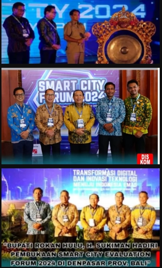 Rokan Hulu–Bupati Rokan Hulu H. Sukiman didampingi Kepala Dinas Komunikasi dan Informatika Rohul H. Syofwan, S.Sos, Kadis PUPR Rohul, Anton ST.MT, Kepala BPBD Rohul H. Ridarmanto,S.IP, M.IP, Plt Dinas Kesehatan drg. Septien Asmarwiati, Kabid IKP Diskominfo Rohul Rudy Fadrial, S.Sos, M.Si, Kabid Jalan dan Jembatan Khairul Fahmi, ST, Kabid Perencanaan Pembangunan Sosial Budaya dan Pembangunan Arkom,S.Si menghadiri acara pembukaan Forum Smart City 2024 di The Meru Sanur, Denpasar, Bali Senin (24/06/2024).