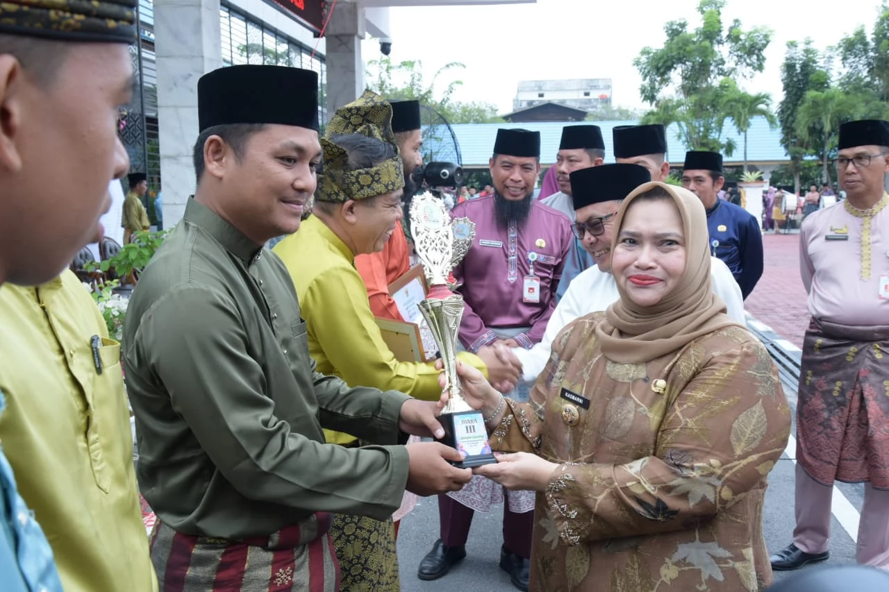 Lintas liputan.com. BENGKALIS – Bupati Bengkalis Kasmarni menyerahkan langsung hadiah kepada para pemenang lomba permainan tradisional yang digelar dalam rangka memeriahkan hari jadi ke-513 Bengkalis usai apel Core Value ASN, Senin, 28 Juli 2025 di halaman Kantor Bupati Bengkalis.