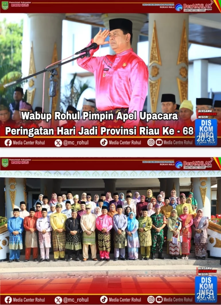 Rokan Hulu —Pemerintah Kabupaten (Pemkab) Rokan Hulu (Rohul) laksanakan apel peringatan hari jadi Provinsi Riau ke 68, Tahun ini tema yang dipilih dalam perayaan Hari Jadi Bumi Lancang Kuning yaitu "Merawat Tuah, Menjaga Marwah". Apel dilaksanakan di Halaman Kantor Bupati Rohul, Sabtu (09/08/2025).