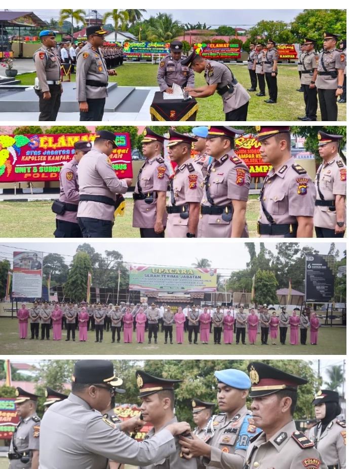 Kepada Kompol Rusyandi Zuhri Siregar, yang menjabat sebagai Kapolsek Kampar Kiri, AKP Rusman yang menjabat sebagai Kabagren, AKP Khairil, yang menjabat sebagai Kapolsek Tapung Hilir, AKP Asdisyah Mursyid, yang menjabat sebagai Kapolsek Kampar, Iptu Ferry Curie Ambarita, yang menjabat sebagai Kapolsek Kampar Kiri Hilir, dan Iptu Dr. Eko WN Besari, yang menjabat sebagai Kapolsek Bangkinang Kota, saya ucapkan selamat atas kepercayaan yang diberikan oleh pimpinan kepada saudara. Agar segera menyesuaikan dengan dinamika kerja yang baru, ciptakan terobosan kreatif, gagasan, ide, dan inovasi ke depan yang lebih maju, dan segera lakukan pembenahan ke dalam, terutama kinerja seluruh anggota, sehingga ada perubahan yang lebih baik dalam pelaksanaan tugas.