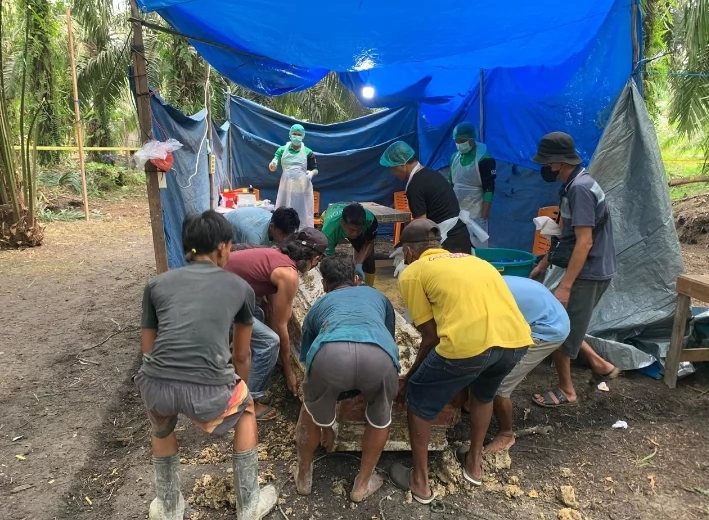 TAPUNG - Kepolisian Sektor (Polsek) Tapung bersama Tim Forensik RS Bhayangkara Polda Riau melakukan ekshumasi (pembongkaran makam) terhadap jenazah Antoni Tampubolon di pemakaman keluarga Desa Pantai Cermin, Kecamatan Tapung, Kabupaten Kampar, Rabu (15/10/2025).