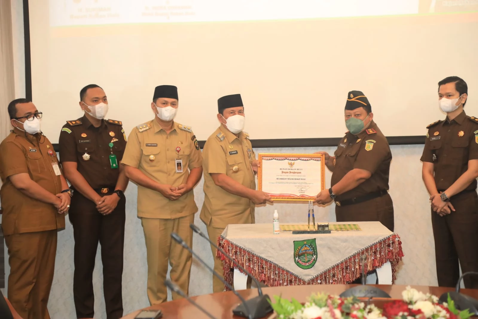 Rokan Hulu – Dalam rangka upaya meningkatkan kerjasama di bidang Perdata dan Tata Usaha Negara di lingkungan Pemerintah Kabupaten (Pemkab) Rokan Hulu (Rohul). Pemkab Rohul dan Kejaksaan Negeri (Kejari) Rohul teken Memorandum of Understanding (MoU) tentang kerjasama di bidang Perdata dan Tata Usaha Negara (Datun), di Ruang Rapat Rumdis Bupati, Selasa (12/4/2022)