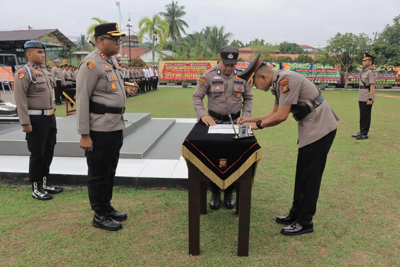 KAMPAR - Polres Kampar menggelar upacara serah terima jabatan (Sertijab) Wakapolres Kampar dari Kompol Andi Cakra Putra, ke Kompol Rizki Hidayat,, Sabtu (27/12/2025) pukul 08.00 WIB di Mapolres Kampar.