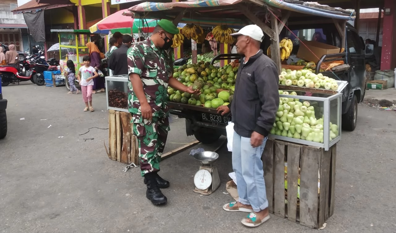 Redelong - Babinsa Koramil 06/Bukit Serda Fadliana melaksanakan Komunikasi Sosial (Komsos) dengan pedagang buah di lokasi pasar Simpang Tiga, Kecamatan Bukit Kabupaten Bener Meriah. Minggu 24/04/2022