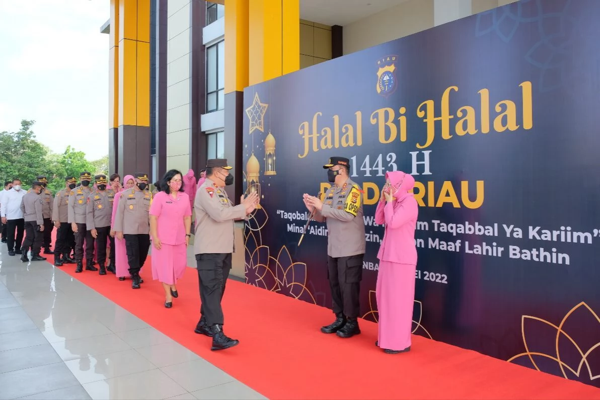 Usai apel, kegiatan dilanjutkan dengan halal bihalal. Kapolda Riau didampingi Ketua Bhayangkari Riau, Nyonya Nindya M Iqbal, Wakapolda dan seluruh pejabat utama beserta istri menggelar halal bihalal dengan jajaran personel Polda Riau. Tujuannya, adalah untuk memperkuat silaturahmi dan persaudaraan di jajaran Korps Bhayangkara Riau.( Rilis/ Abdul Hamid)