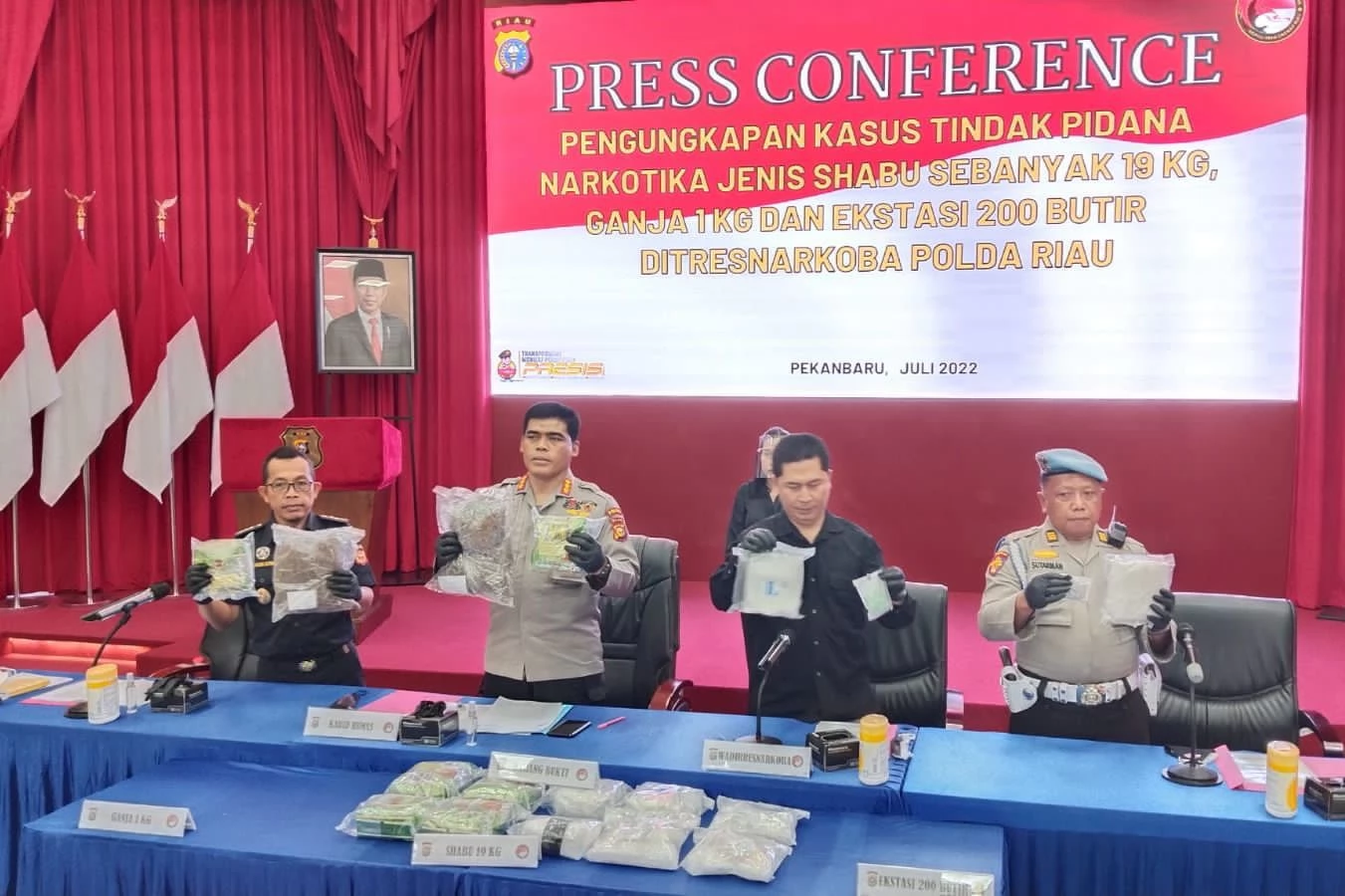Kabid Humas Polda Riau Kombes Sunarto saat menggelar konferensi pers bersama pihak Bea Cukai Riau dan Wadir Resnarkoba pada Kamis (27/7) mengatakan OW disergap Tim Opsnal saat membawa 200 butir ekstasi yang disimpan dalam kantong dan digantung di dashboard kiri sepeda motor yang dikendarainya, Yamaha Mio BM 2184 NC di Jalan Karet No 26 RT 05 RW 05 Kelurahan Sago Kecamatan Senapelan Kota pada Sabtu (25/6/2022).