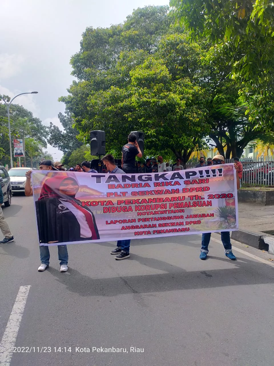 Massa membawa berbagai spanduk aspirasi dan menuntut keseriusan serta atensi Kapolda Riau dalam pengusutan kasus dugaan pemalsuan nota atau kwitansi pada laporan pertanggungjawaban di Sekretariat DPRD Kota Pekanbaru senilai Rp1,1 miliar tahun 2021.