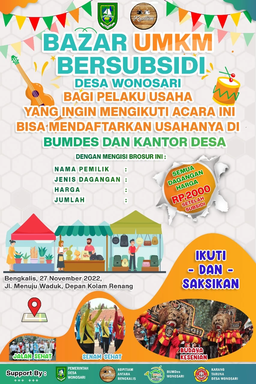 Di jelas kan nya lagi kegiatan ini juga ada jalan santai,kesenian budaya ,senam sehat,komonitas band jalanan.konsep ini sebagai promosi terkait pengembangan pariwisata Bumdes unggul sari desaWonosari yakni parawisata kuliner Bumdes unggul sari,terpantau di lapangan sudah siap Bazar lima tempat usaha Bumdes unggul sari, dan acara di ada kan pada 27/11/2022. Yaitu hari Minggu pagi. pungkas nya.( Abdul Hamid)