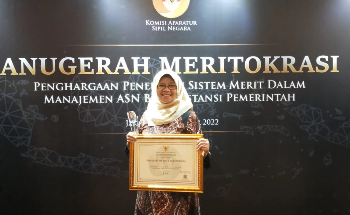 Untuk itu, Wako menyampaikan terima kasih kepada pimpinan SKPD yang sudah terlibat dalam proses sehingga masuk kategori daerah terbaik se-Indonesia," ungkap Sustinna, Kamis (08/12). Wali Kota Bukittinggi selaku pejabat pembina kepegawaian, kembali terima Anugerah Meritokrasi Tahun 2022 kategori Baik. Anugerah itu diterima Wali Kota yang diwakili oleh Kepala BKPSDM Bukittinggi dari Ketua KASN, di Hotel Grand Sahid Jaya, Jakarta, Kamis, (08/12).