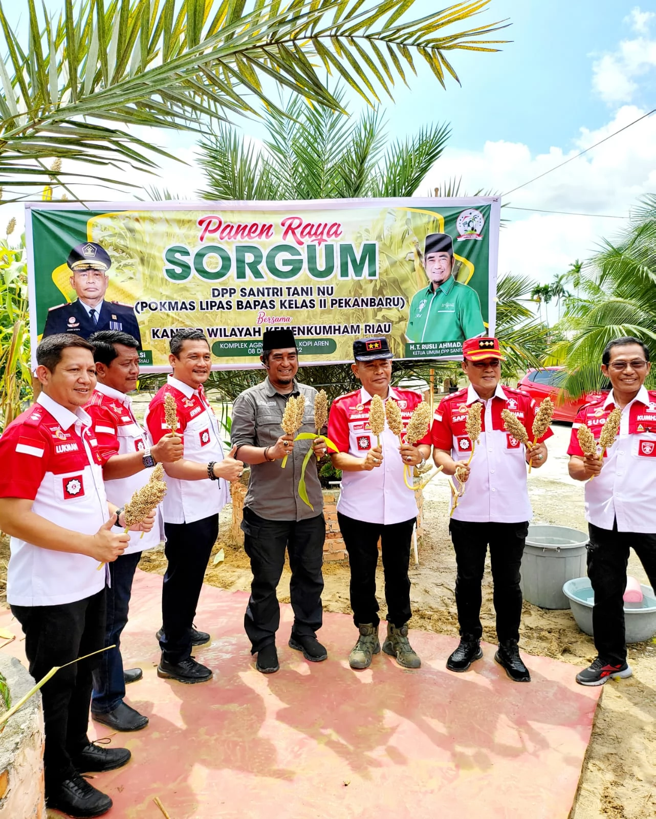 Kepala Kantor Wilayah Kemenkumham Riau didampingi Kepala Unit Pelaksana Teknis Pemasyarakatan se Kota Pekanbaru disambut langsung oleh Ketua DPP Santri Tani Nahdatul Ulama K.H. T. Rusli Ahmad, S.E., M.Si. melaksanakan kegiatan panen raya Sorgum dan penanaman bibit cabe yang merupakan hasil kegiatan dari Klien Bapas Kelas II Pekanbaru.