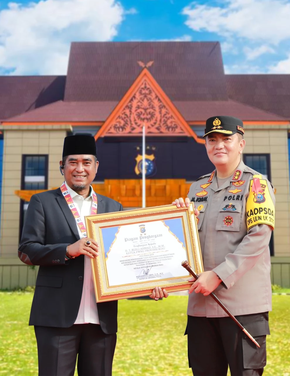 Pekanbaru - Kapolda Riau berikan Piagam Penghargaan kepada Ketua PWNU Riau H.T.Rusli Ahmad,SE,MM, dalam rangka peran aktif mendukung keberhasilan Kepolisian dan menciptakan kerukunan umat beragama dalam pemeliharaan keamanan, ketertiban masyarakat di wilayah hukum Polda Riau.Kamis(29/12/22)